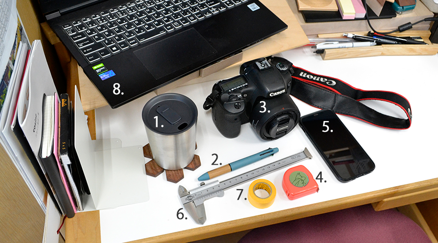 1.タンブラー 2.ボールペン 3.カメラ 4.スケール 5.スマホ 6.ノギス 7.マスキングテープ 8.パソコン