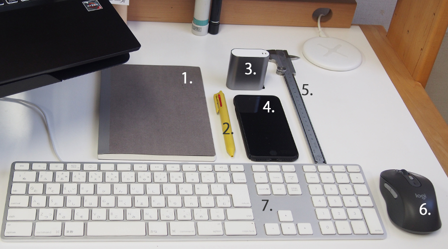 1.ノート 2.ボールペン 3.スケール 4.スマホ 5.ノギス 6.マウス 7.パソコン
