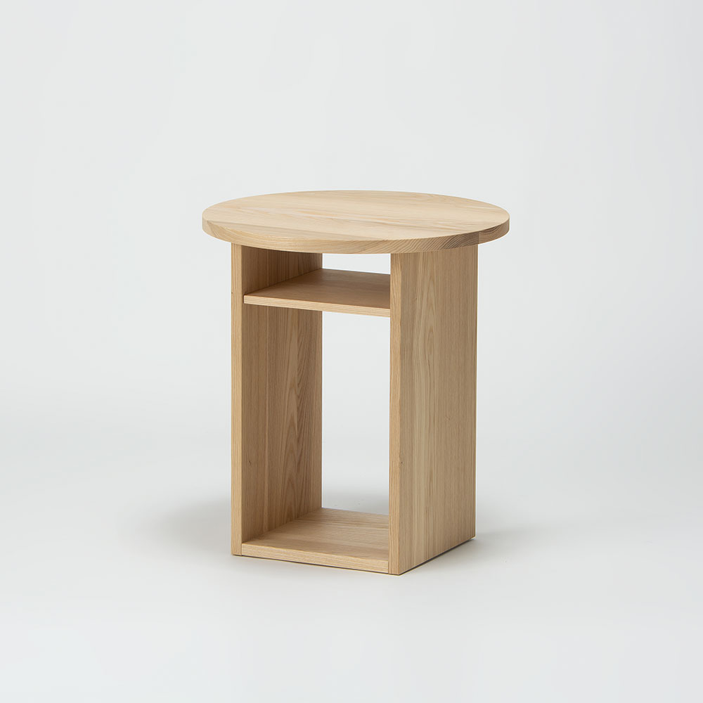 正円の天板と長方形のボックスという幾何学的な組み合わせですが、見る角度や置くものによって様々な表情を見せてくれるサイドテーブルです。