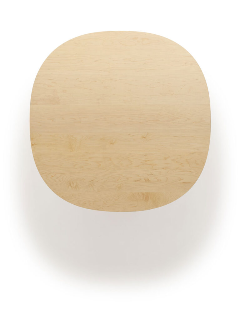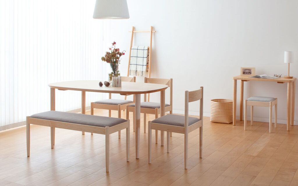 空間をやわらげる、ゆるやかな楕円の「ダンランテーブル」。家族や友人と丸く囲んで、心地よい時間を楽しめるダイニングテーブルです。