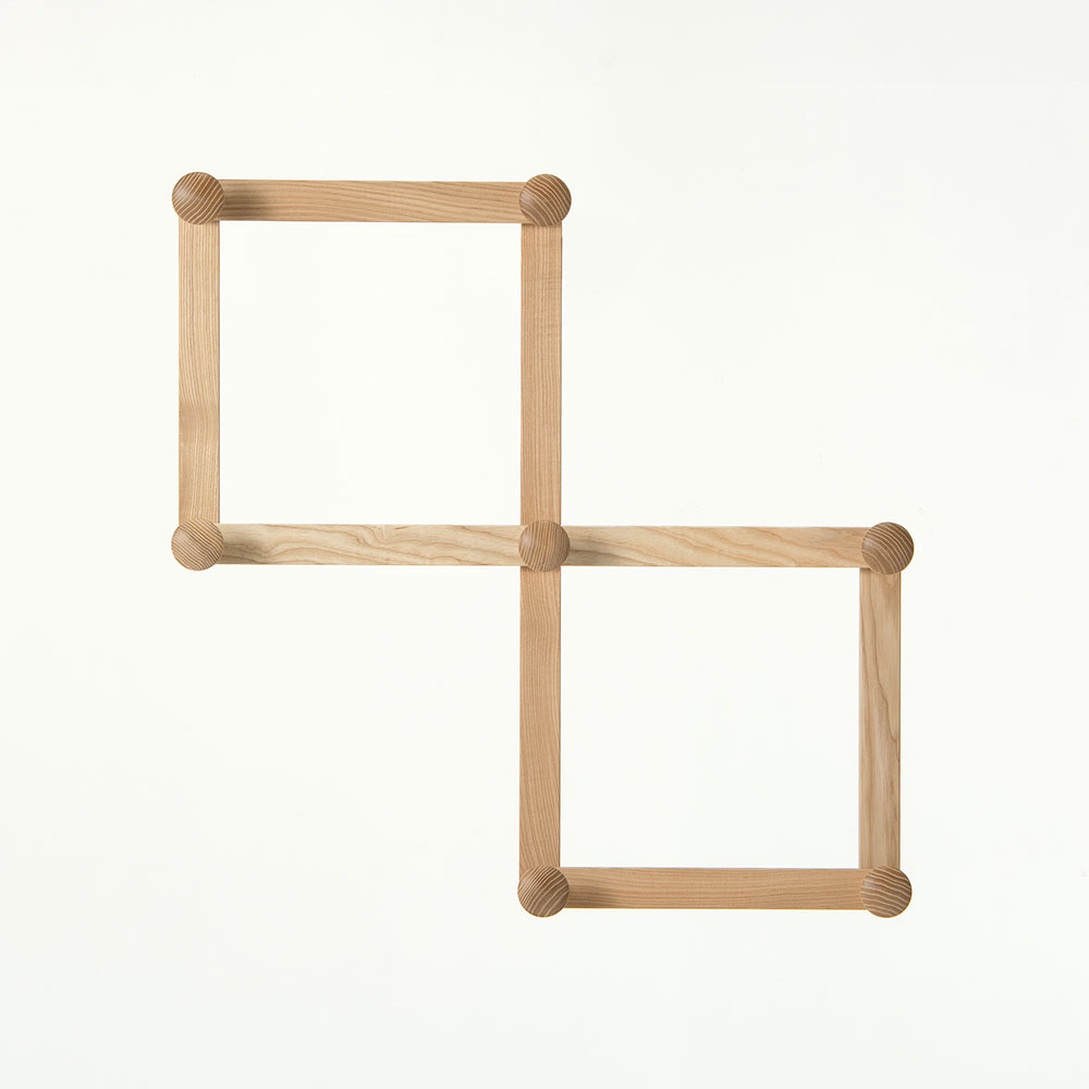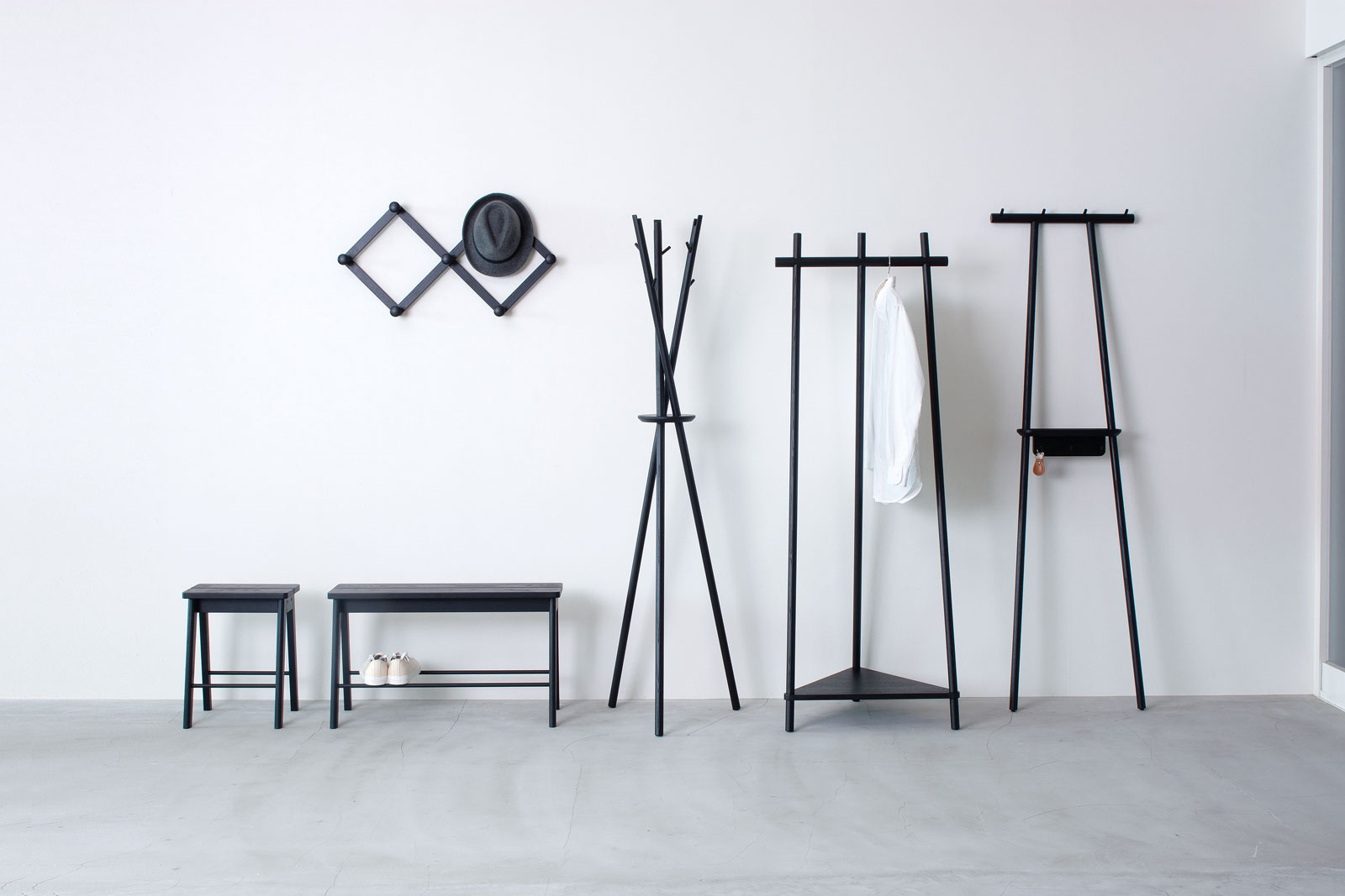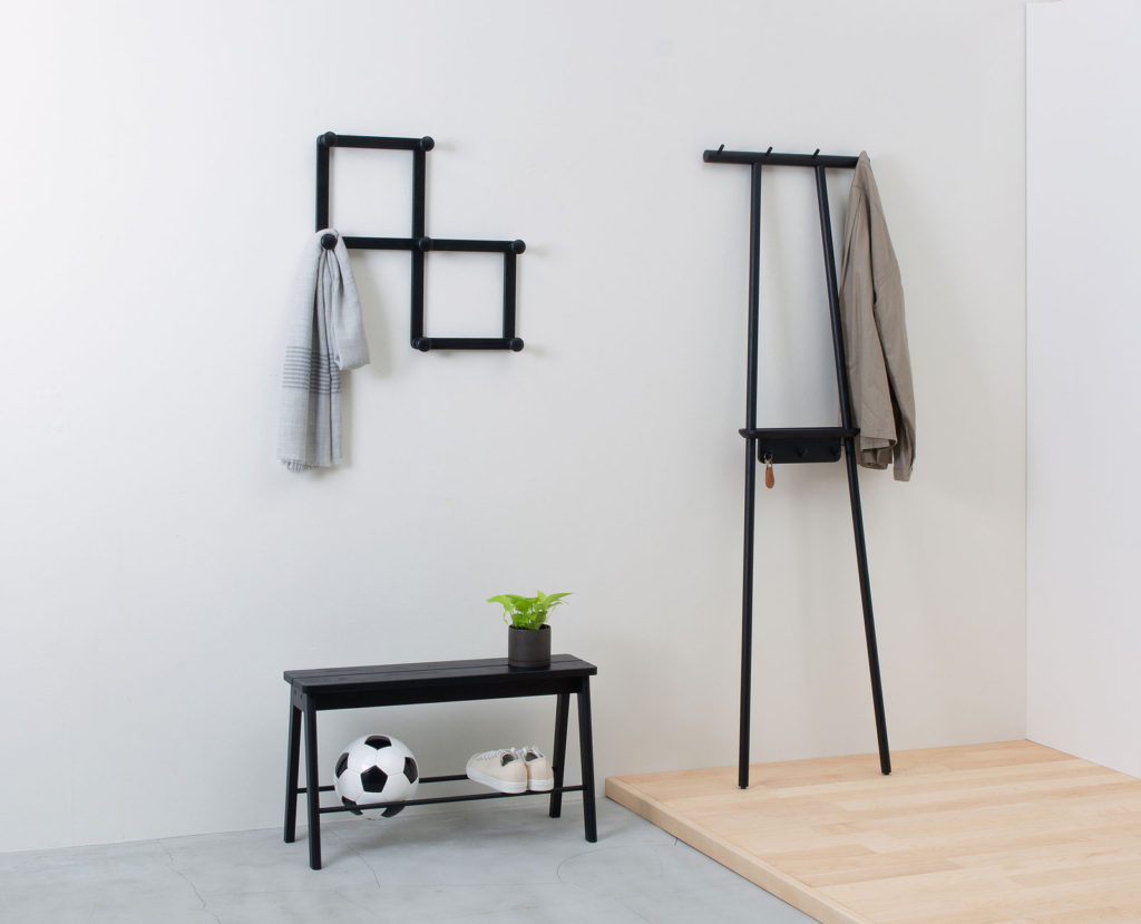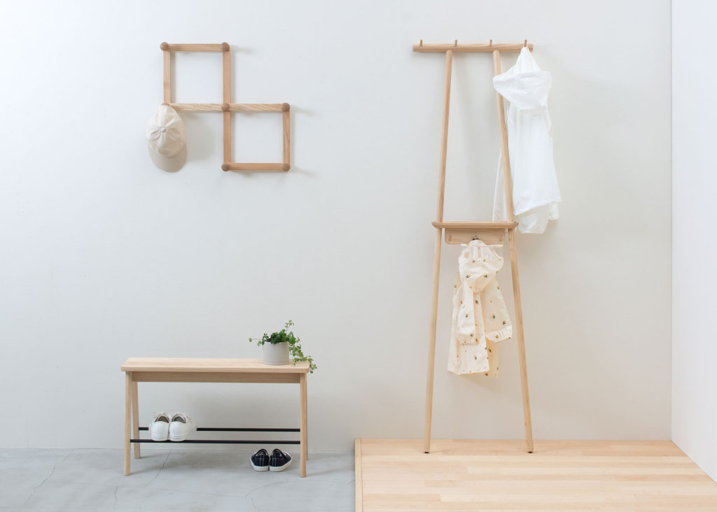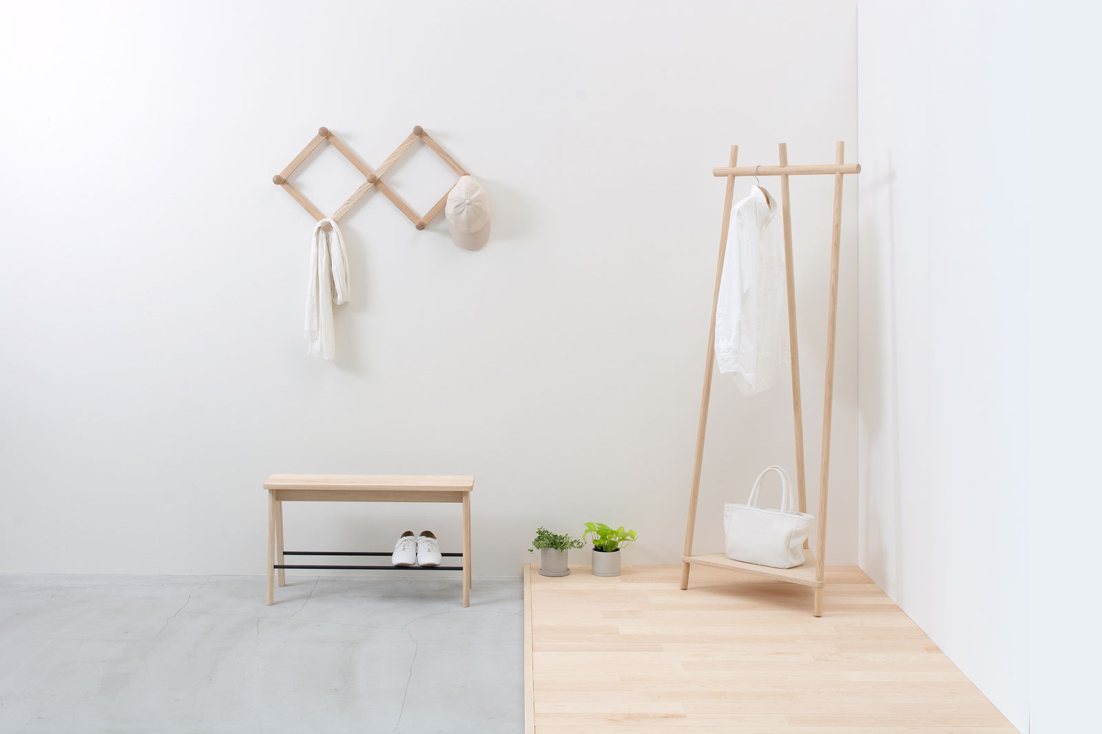 各パーツは端部まで丁寧に加工され、無垢材から削り出された丸みのあるフックが壁面にアクセントを与えてくれます。