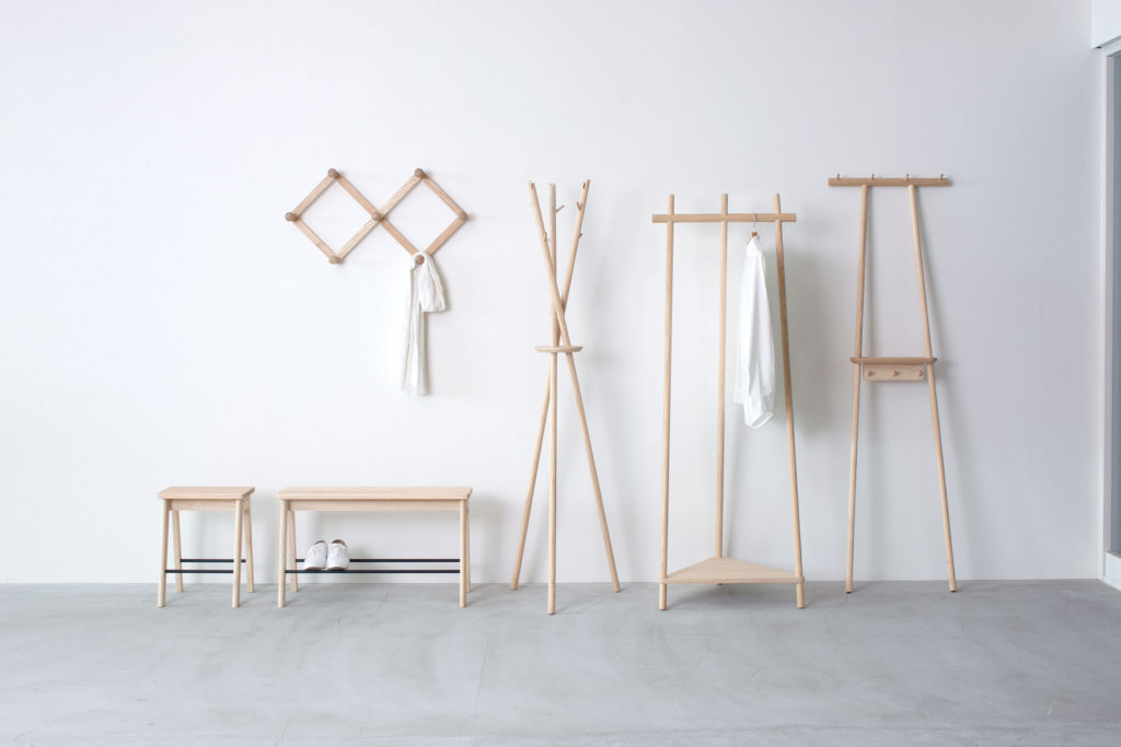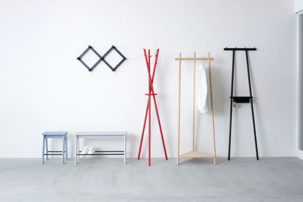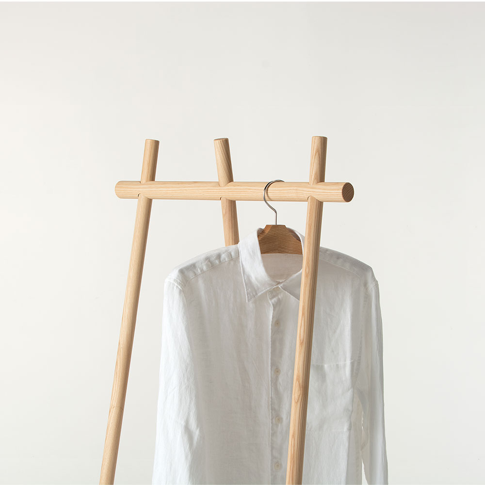 丸棒が交差して突き出た部分には、帽子やマフラーなどを掛け、三角の棚板にはバックなどを置くことができます。
